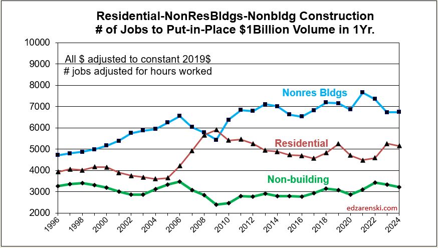Nonresidential Bldgs volume (spending after adjusting for inflation), increased 28% in the last 18 months. Nonres Bldgs jobs increased only 7%, and hours worked (OT) did not increase. That leaves 21% of Nonres Bldgs volume that was put-in-place without a balancing increase in jobs. The added work got absorbed into the existing workforce. That’s a very hard fact left unexplained by the argument that there are jobs shortages. As one reader commented, there are some reasons why more $ value of work is counted at the jobsite with less jobs, i.e., prefab, but not 21% of all Nonres Bldgs work.
