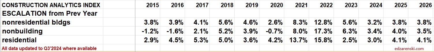 for 2024 vs 2023, as of Dec 2024 data, is up 6.5%. All sectors gained between 6% and 7% over 2023. Growth is forecast at 5.5% in 2025. While Residential and Non-building Infrastructure will both gain 7%, Nonresidential Buildings will only see growth of 2% in 2025.