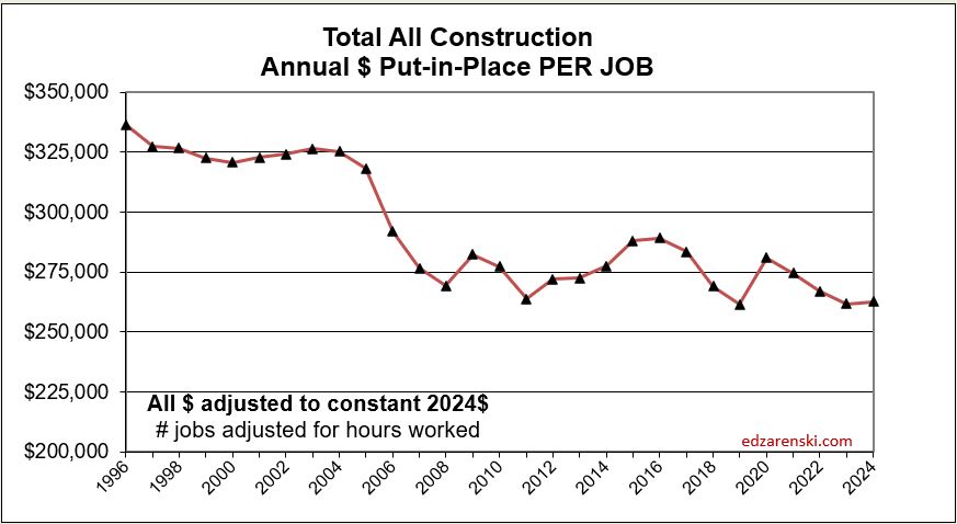 Construction spending in 2024 will hit near $2.15 trillion, another new high, up 50%+ since 2019. (The last time constr spending declined was 2011. Construction volume, (spending minus inflation) will finish the year up only 10% since 2019.
