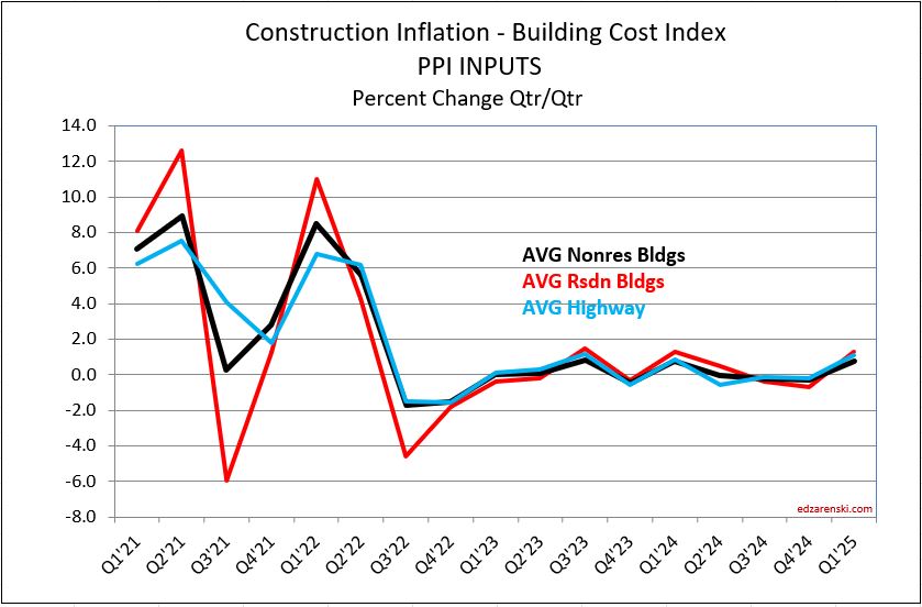 PPI INPUTS Q1 vs avg 2024: to Nonres Bldgs +0.9%, to Residential +1.15%, to Highway +1.0%. All these being near 1% for Q1, if growth is constant, would be near 4% for the year. Big IF! Paving mixtures +11% in Q1, Lumber Plywood +4.5%, Fab Str Steel +0.03%, Fab Str Stl Bridges -1.1%, #2 Diesel Fuel -9.6%, Steel Pipe and Tube -3.85%, Nonferrous Wire and Cable +1.8%, Copper and Brass Mill Shapes +4.7%, Aluminum Mill Shapes +7.5%.