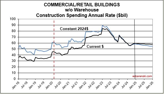 Biggest forecast declines in Current$ construction spending: Residential -5.8% (by far largest $ decline, -$55bil); Manufacturing – 6.5%, -$15bil; Warehouse -10%, -$7bil; Office (ex Data Centers) -10%, -$7bil; Comm Retail (ex Warehouse) -8%, -$6bil.