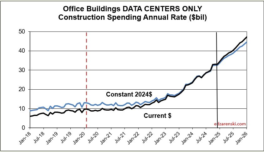 Data Centers are the bright spot in construction spending, up 17% since December and forecast to finish the year up 30%, an increase of +$10bil.