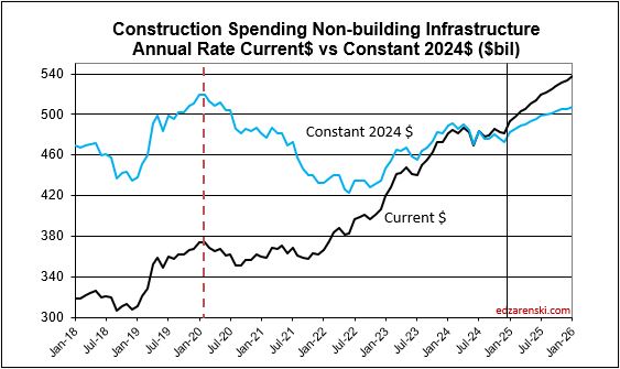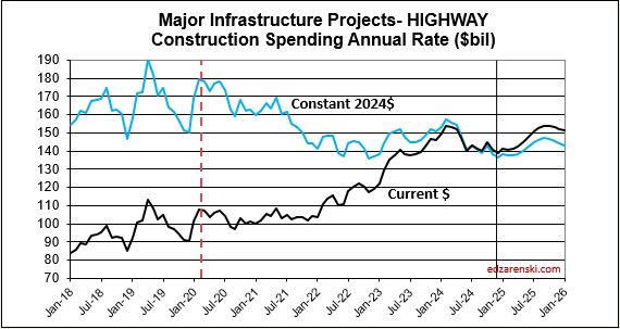 The same effect on spending by the tapering off of Manufacturing Bldgs ending will happen in Infrastructure spending due to the current increases in Highway/Bridge, only ending a few years later.