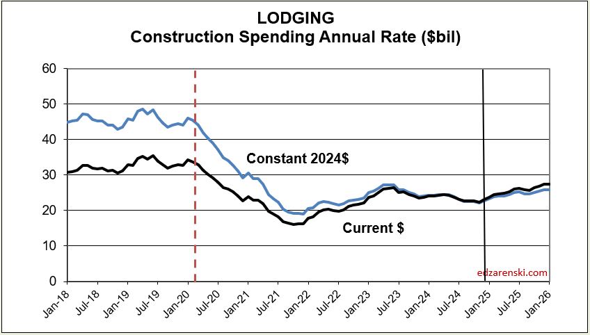 Lodging SAAR rate of spending begins 2025 3% lower than the average for 2024. Starts are up 14% in 2024 and 20% over the last 2 years. The rate of spending, lower in the 2nd half 2024, increases at an average of 1.25%/month for 2025. My forecast is for 9.5% spending growth in 2025.
