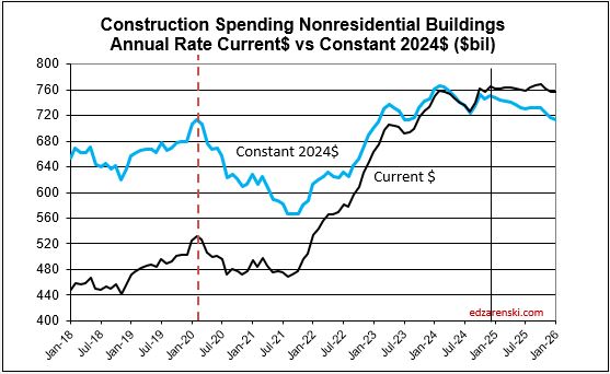 Manufacturing is still the largest $ contributor ($222bil/yr) to nonresidential bldgs total spending ($772bil/yr), but has fallen 6% in the last 5 months. The trend is down in most months for 2025 and down in 2026. This decline is entirely expected and you can read about it in my article, The Manufacturing Taper.