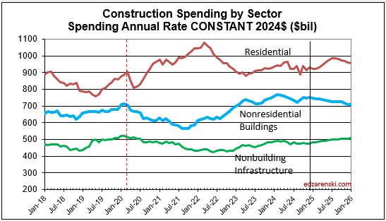 Environment for construction jobs looking difficult. Constant $ spending in 2026 is down just less than 1%. But Volume of work (spending minus inflation) available is down just over 4% and is declining all through 2026. Biggest declines by far, Manufacturing and SF Rsdn.