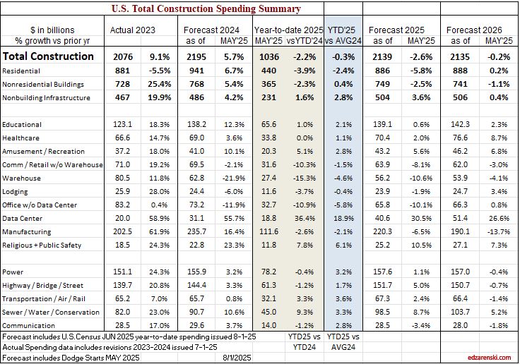 The total construction spending forecast, now at $2,237bil, +3.7% vs. 2024, has been lowered a bit since the Outlook in Feb. ($2,272bil, +5.5%). Most of the reduction is in Residential, from $997bil, +7.2% down to $958bil, +3.0%. Nonres Bldgs was reduced by $11bil and Nonbldg increased by $7bil. Compared to the average for the year 2024, current total spending YTD is up 2.6%, but is expected to pick a little up throughout the year across all sectors.