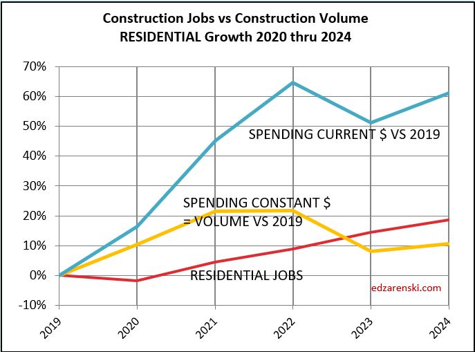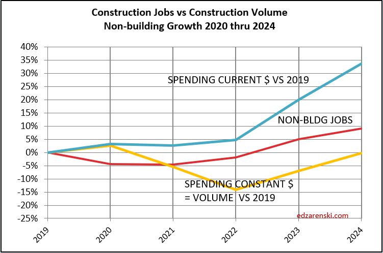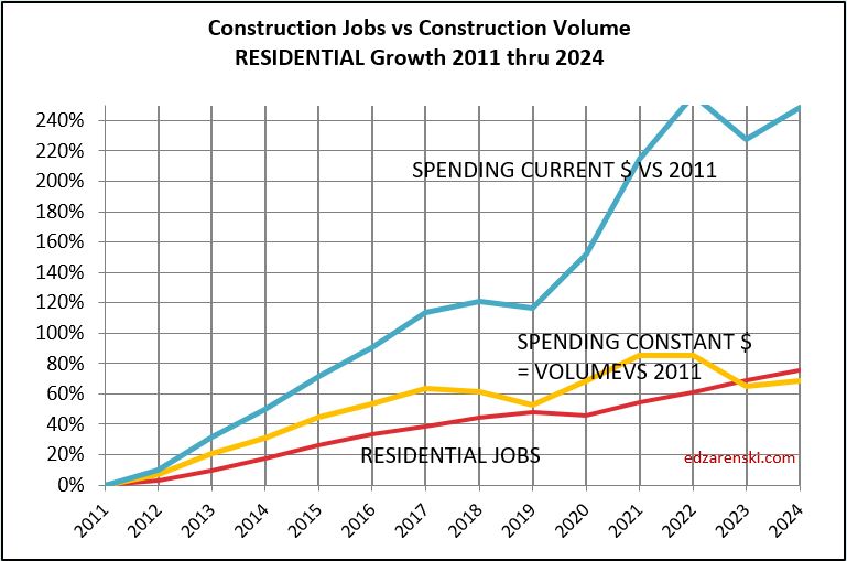 What’s remarkable about the growth is this, since 2016, spending has increased 63%, volume after inflation increased 6% and jobs increased 19%. In the last 7 years, 2017-2023, jobs increased 2.5%/yr. Volume of work increased only 0.8%/yr. Volume and jobs should be moving together.