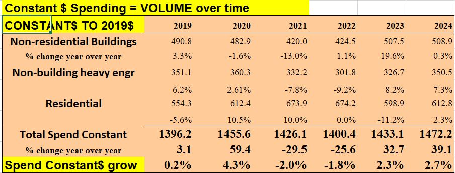 Inflation adjusted volume is spending minus inflation, or to be more accurate, spending divided by (1+inflation). Inflation adds nothing to volume growth. The following table shows spending, inflation and volume (spending without inflation) for each year. Spending is current to the year stated. The values in the constant table are indexed to a constant value year, 2019. This shows business volume year to year, can be a lot different than spending would indicate. When inflation is positive, volume is always less than spending by the amount attributed to inflation.