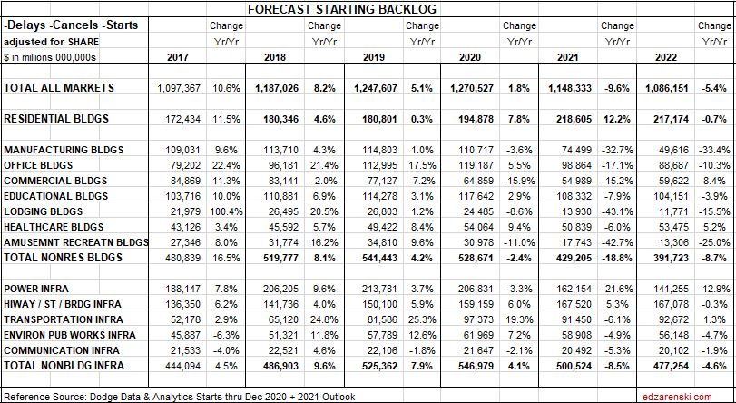 Nonresidential construction starts in backlog at the beginning of the year provide for 75% to 80% of all spending in 2021. New starts in 2020 were down 24% for buildings and 14% for non-buildings, so backlog is down. It would be difficult to show any scenario that has these sectors up in 2021.