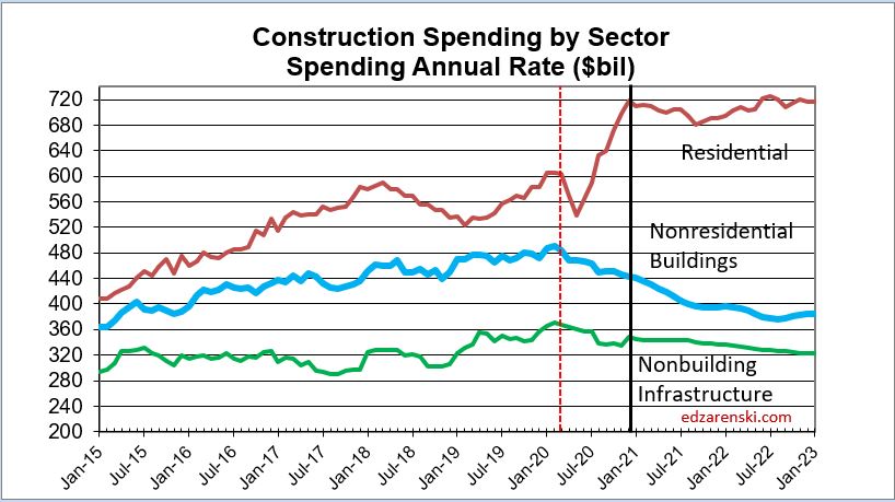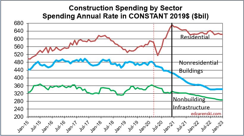 Before we can look at the effect on jobs, we need to adjust spending for inflation. The plot above “Spending by Sector” is current dollars. Here that plot is adjusted for inflation and is presented in constant $. Constant $ show volume. Notice residential remains in a narrow range after adjusting for inflation. No sector shows improvement in volume through Jan. 2023.