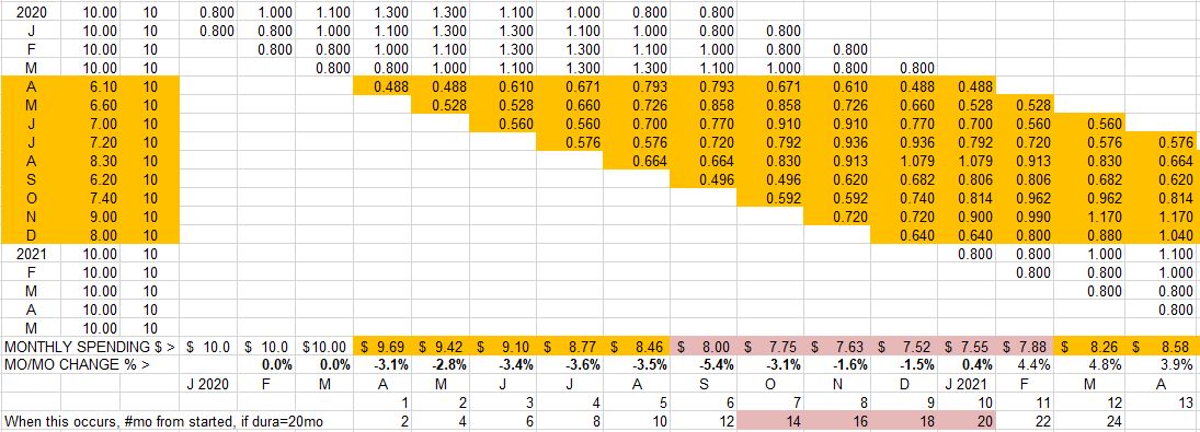 This cash flow schedule is based on reduced starts in Apr-Dec 2020. All other months are considered at 100% of the pre-pandemic rate. This sample uses $10bil/mo of new starts as 100%, the high in the 1st quarter, carried out over a 10mo schedule. If the rate of starts were to remain constant at $10bil/mo, then the spending would also remain constant at $10bil/mo. The amounts carried for April to Dec represent the actual starts recorded, measured as a percent of previous high, the 1st quarter 2020, so $6.6 bil in May is 66% of the pre-pandemic highpoint average, which here is $10bil.